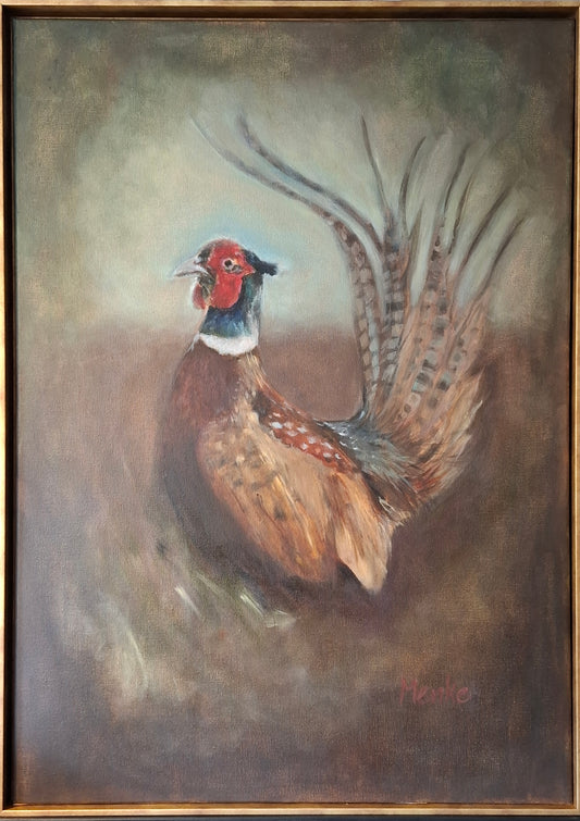 Fazant op de hei: origineel olieverfschilderij inclusief lijst, 50x70 cm