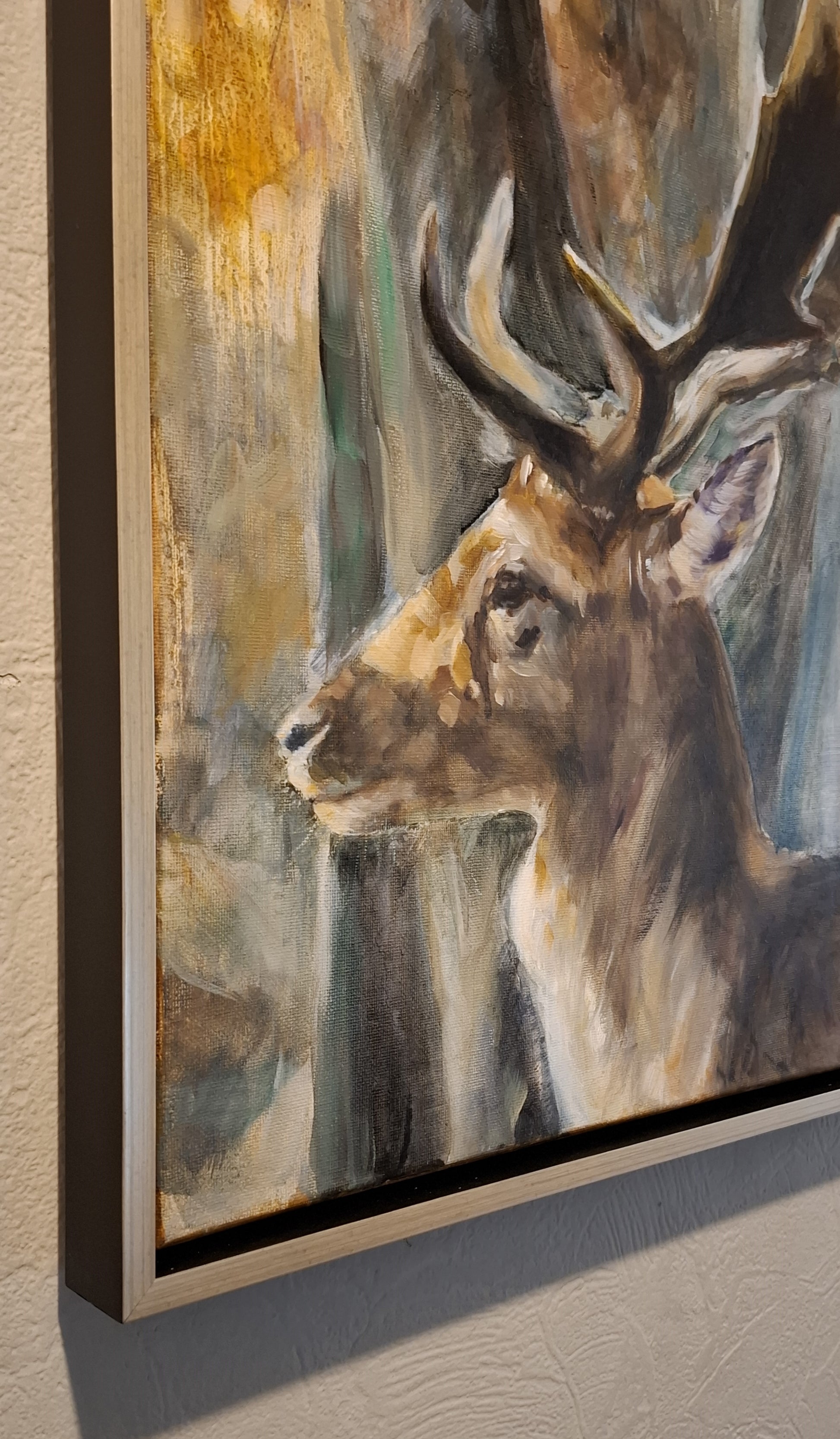 Damhert in een herfstbos, origineel olieverfschilderij met lijst, 40x50 cm