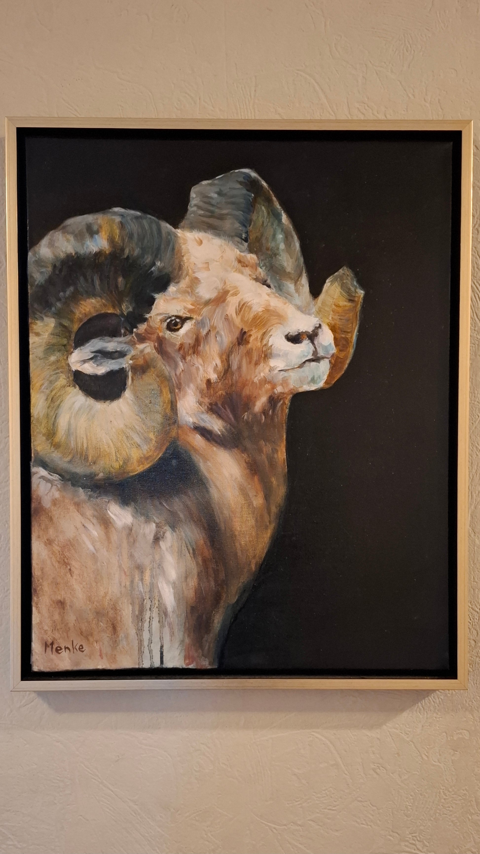 Dikhoornschapen vind ik fantastisch om te schilderen. Met hun mooie hoorns en ruige vacht lenen ze zich perfect voor een semi-losse stijl die perfect past bij landelijke interieurs in gedempte kleuren.