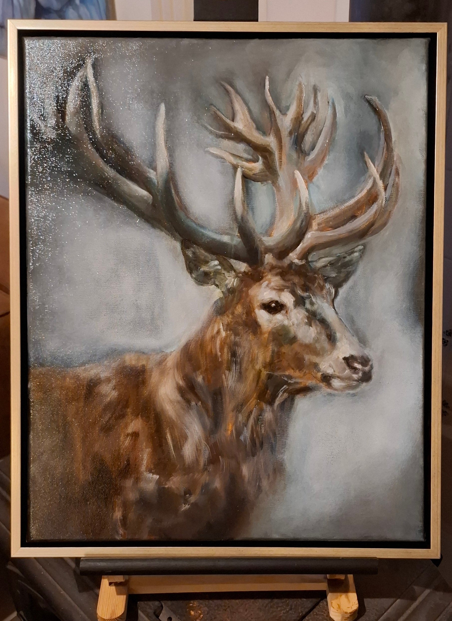 Hert in mistig bos: origineel olieverfschilderij van 40x50 cm inclusief lijst