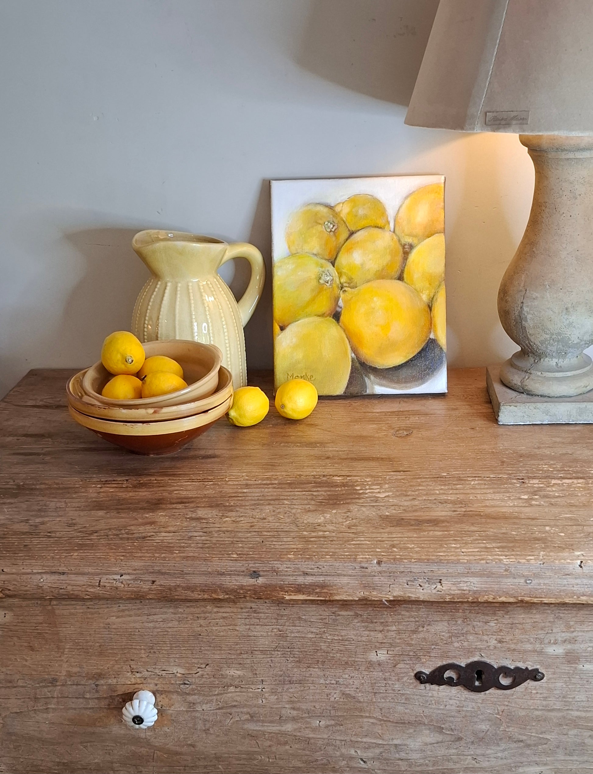 Deze studie van citroenen maakte ik tijdens een hittegolf. Super leuk om met zo'n frisse kleur bezig te zijn, na in de winter en lente vooral met donkerder kleuren gewerkt te hebben. Dit lijkt me het perfecte schilderijtje voor in een keuken, serre met mediterrane planten, of ergens anders in een kleurrijk huis! Stuur je me een berichtje als je het hebt opgehangen?