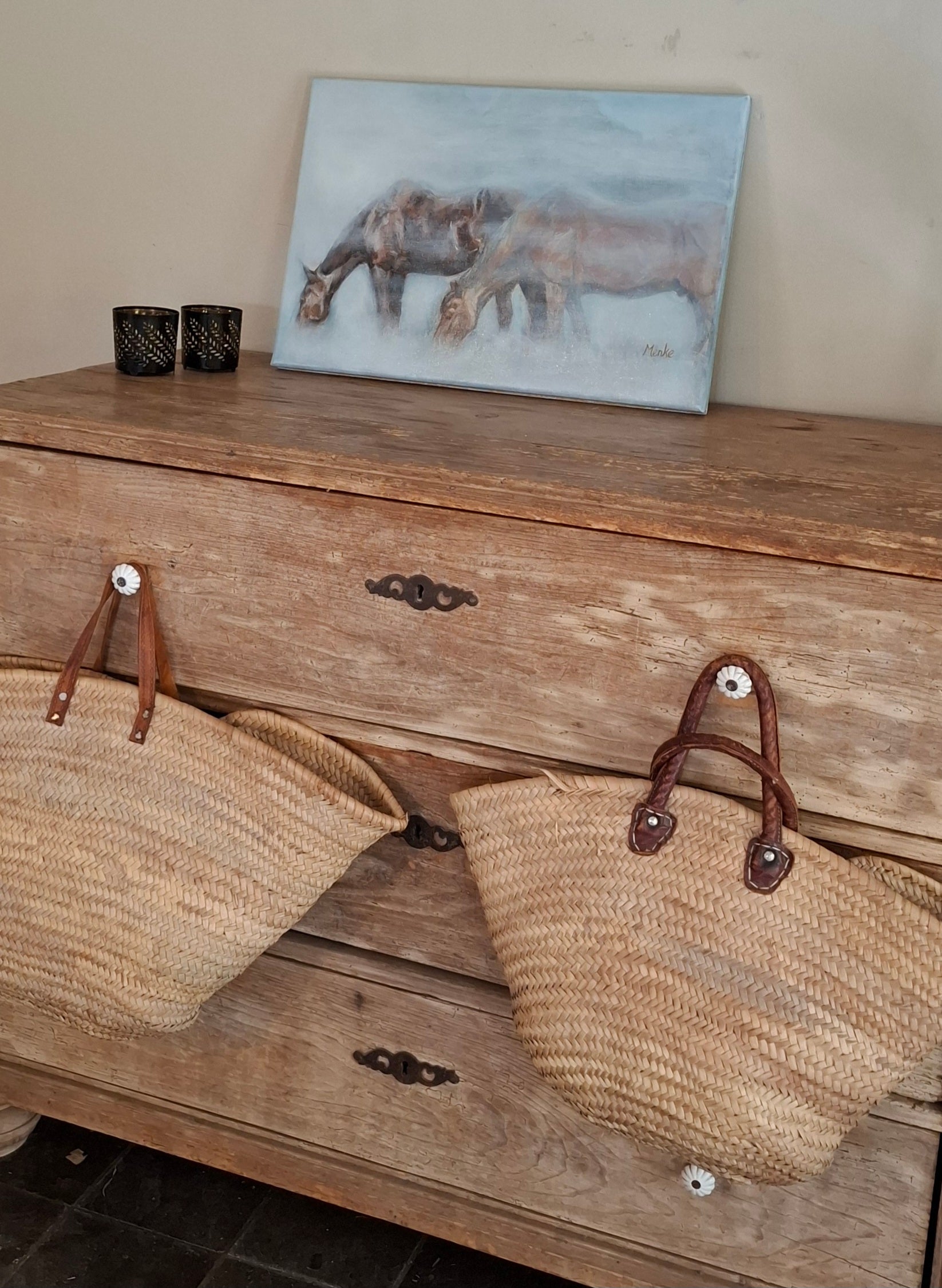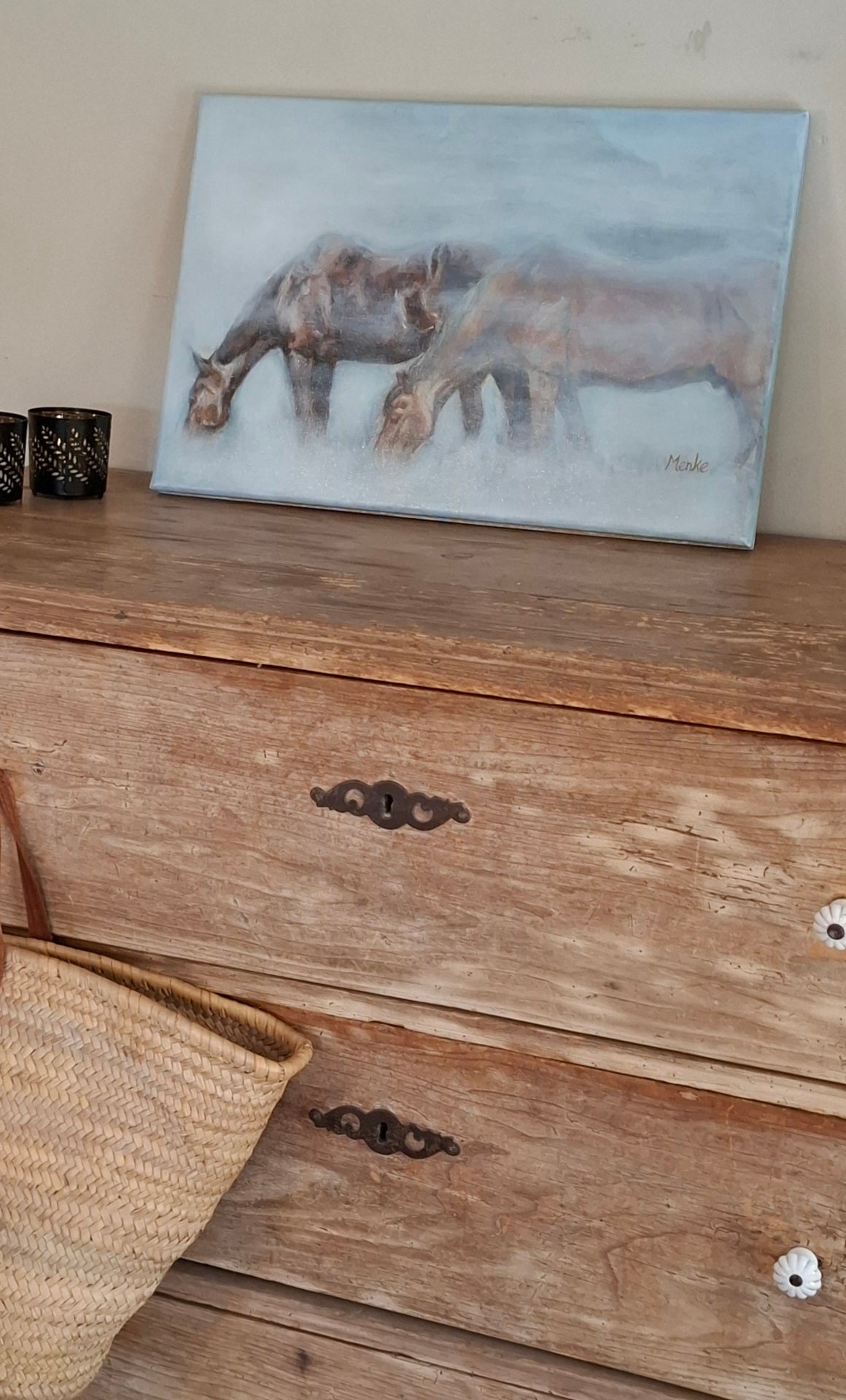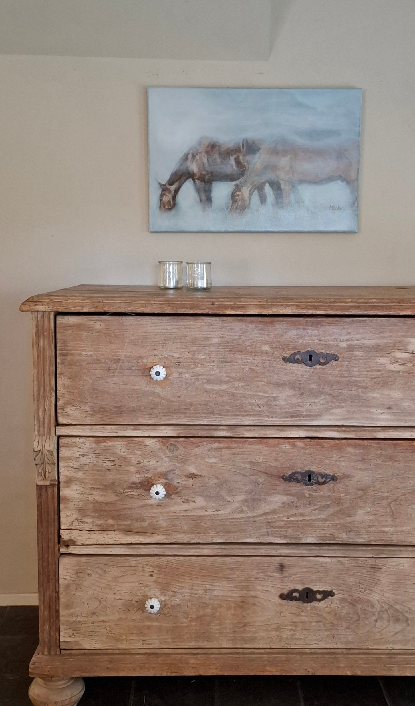 Een rustgevend schilderij van twee dikke vrienden in een mistig weiland. Oorspronkelijk maakte ik dit werk in acryl voor de tentoonstelling 'Storytellers' van het collectief Paard Verzameld in 2021. Later voegde ik mer olieverf de mist toe. Het schilderij is afgewerkt met een licht glanzende laag retoucheervernis.